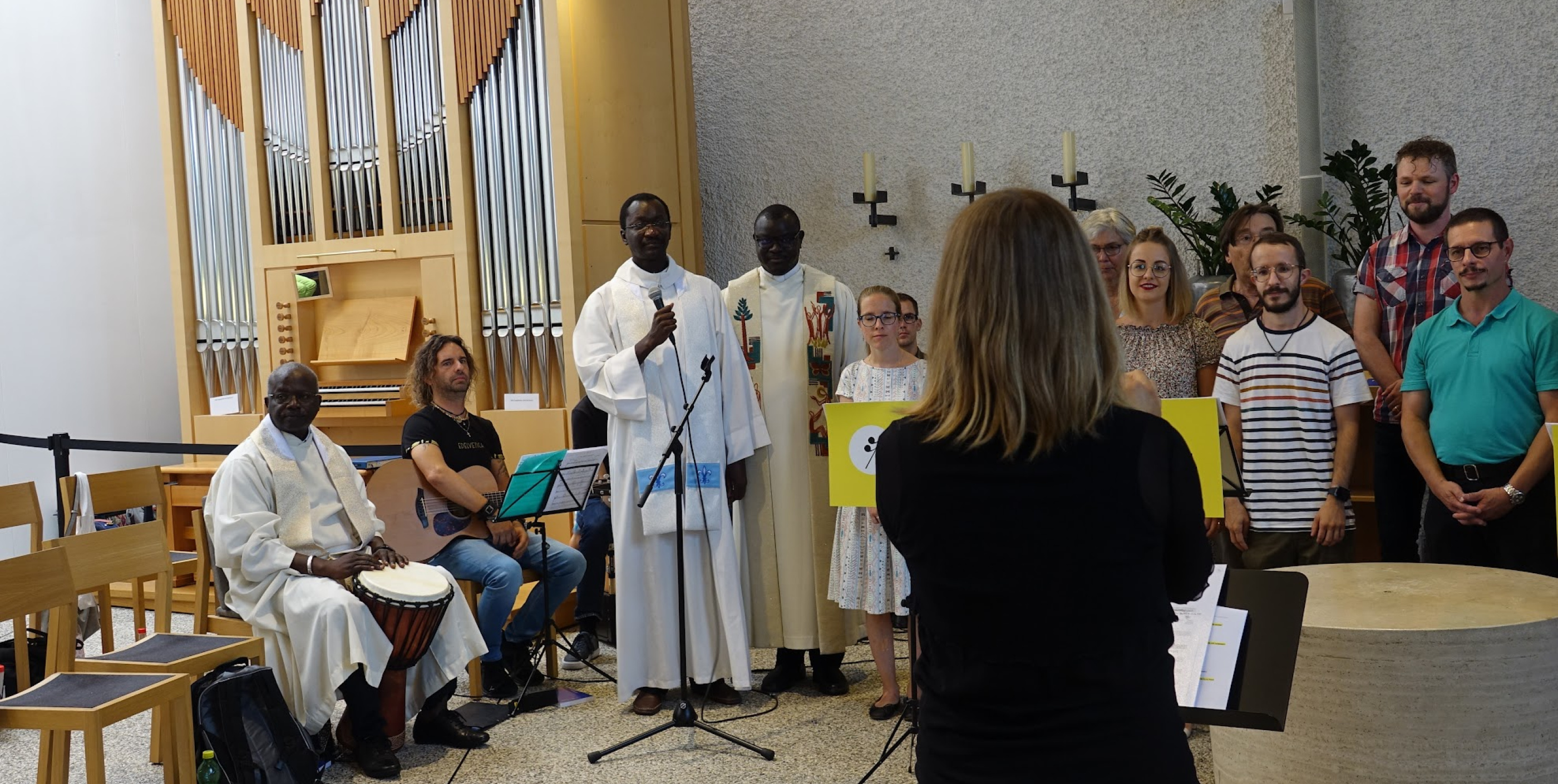 Bei einer afrikanischen Version des Magnifikats wirkten die drei Abbés aus Senegal als Drummer und Solisten mit, zum grossen Gaudi des Publikums.