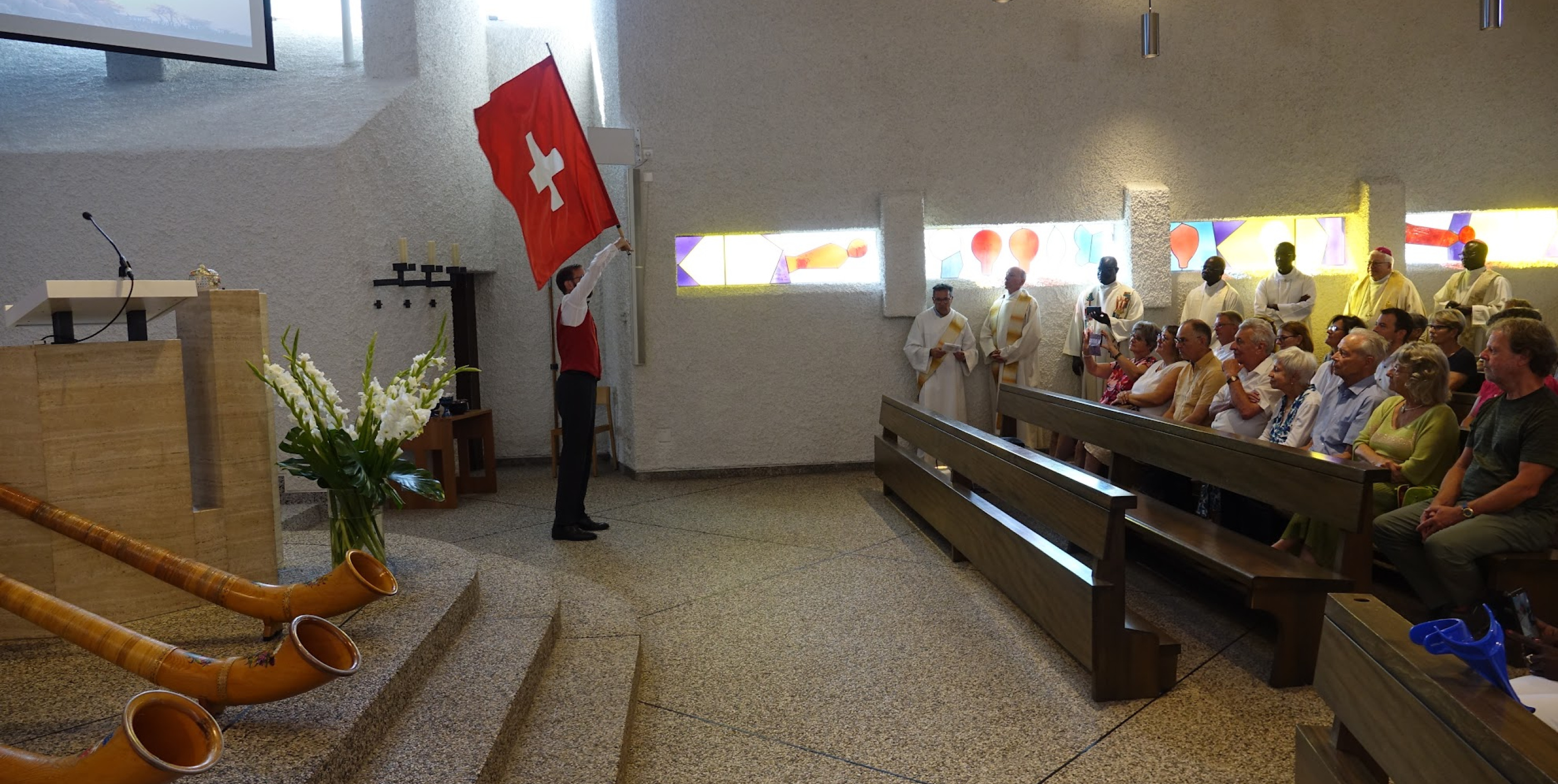 Einen besonderen Akzent setzte ein Alphorntrio mit seinen Klängen beim Einzug und als Abschluss des Gottesdienstes. Als Überraschung trat dabei der Vizepräsident von Hand für Afrika, Patrick Guidon, als versierter Fahnenschwinger auf.