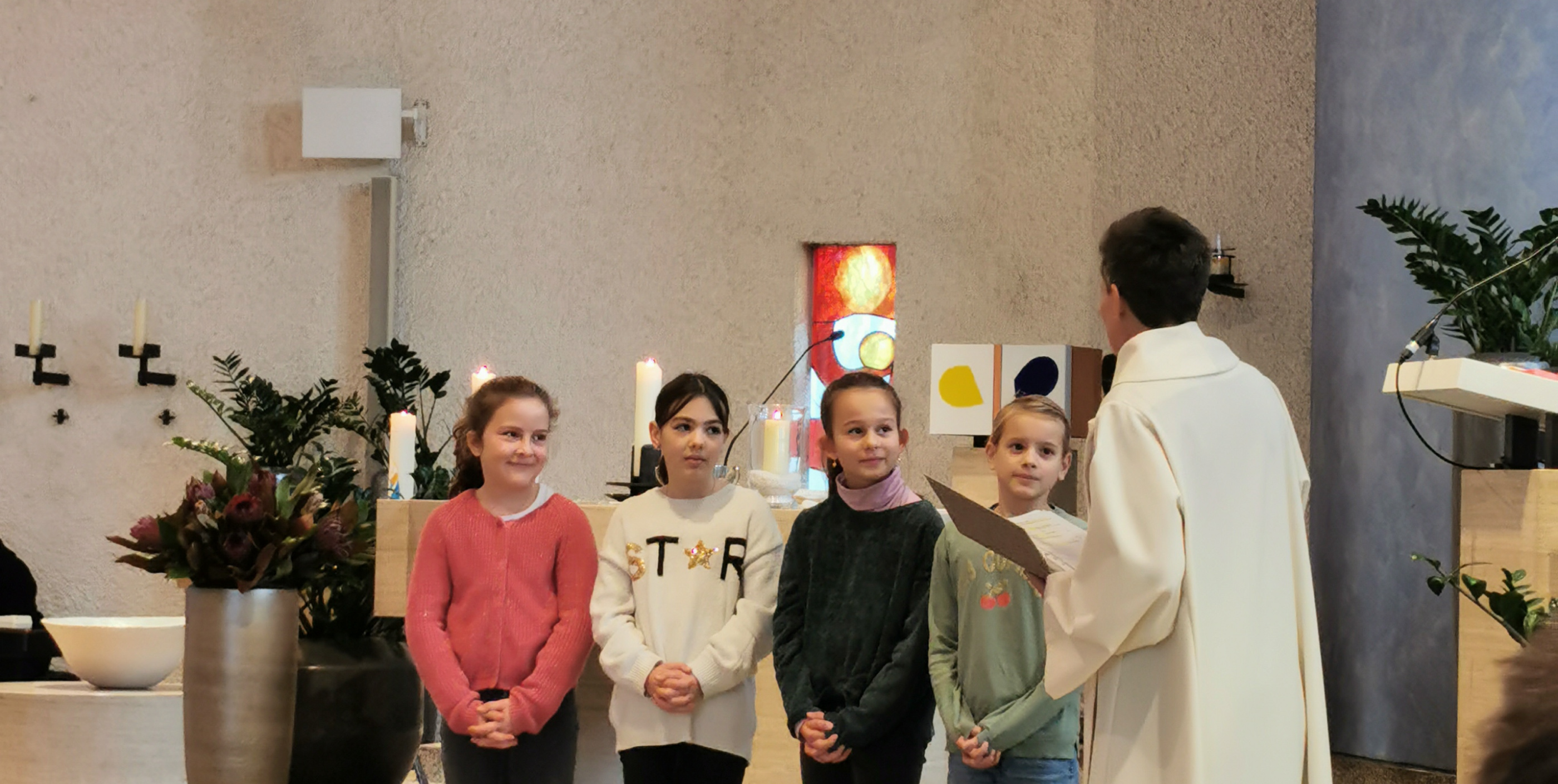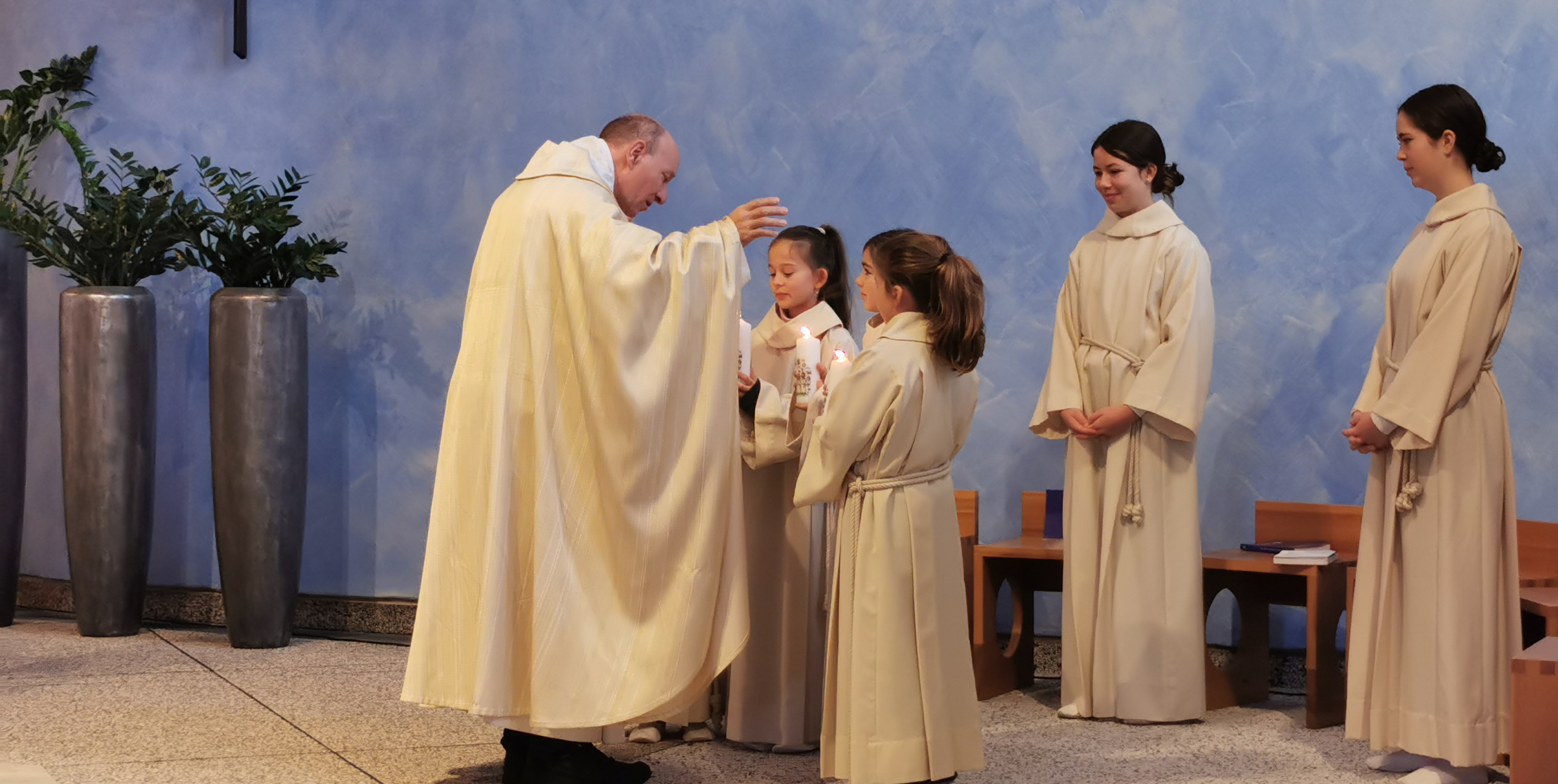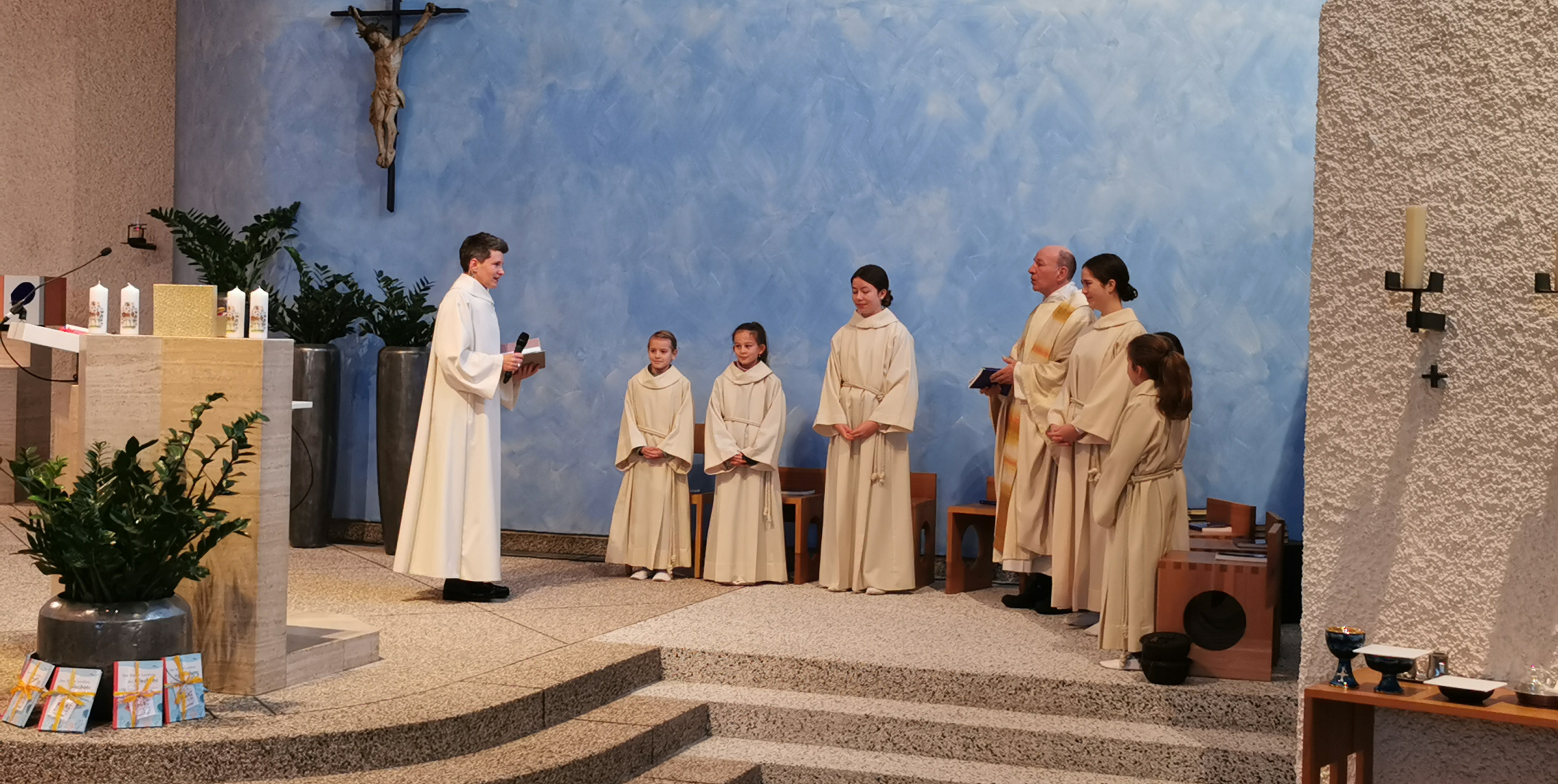 Am Sonntag, 26. November 2023 wurden vier neue Ministrantinnen feierlich in unsere Ministrantenschar aufgenommen. In einem besonderen Moment kleideten unsere langjährigen Ministranten die "Neuen" symbolisch ein – ein Zeichen der Gemeinschaft und Tradition. Die neuen Minis strahlten vor Begeisterung und freuen sich darauf, aktiv im Gottesdienst mitzuwirken.
