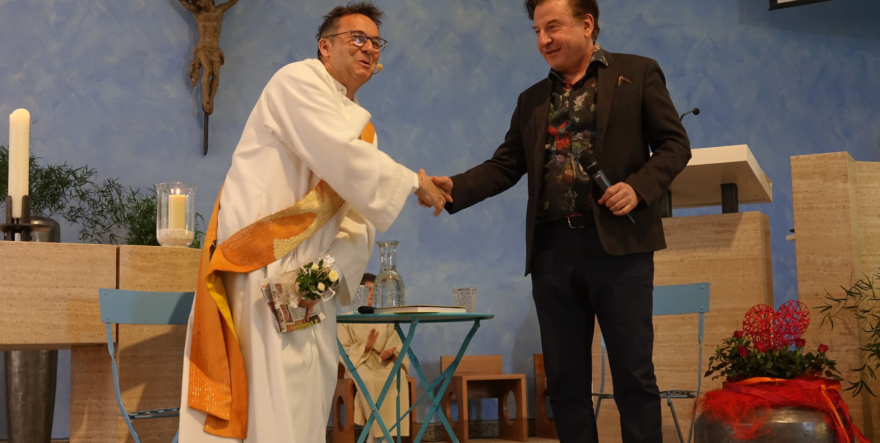 Der Schweizer Kabarettist, Schauspieler und Drehbuchautor Beat Schlatter diskutierte im Teufener Gespräch an der Kanzel mit Diakon und Pfarreileiter Stefan Staub über das Leben, die Gesellschaft und den Glauben.