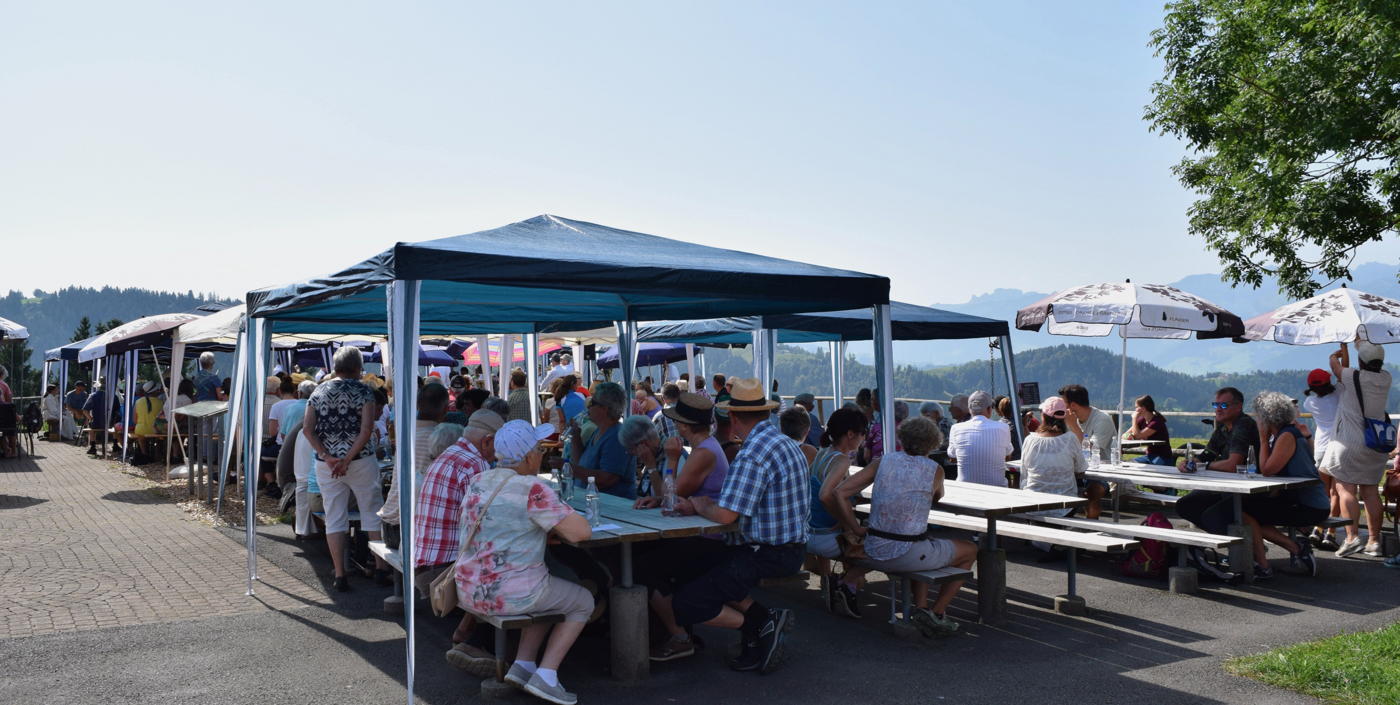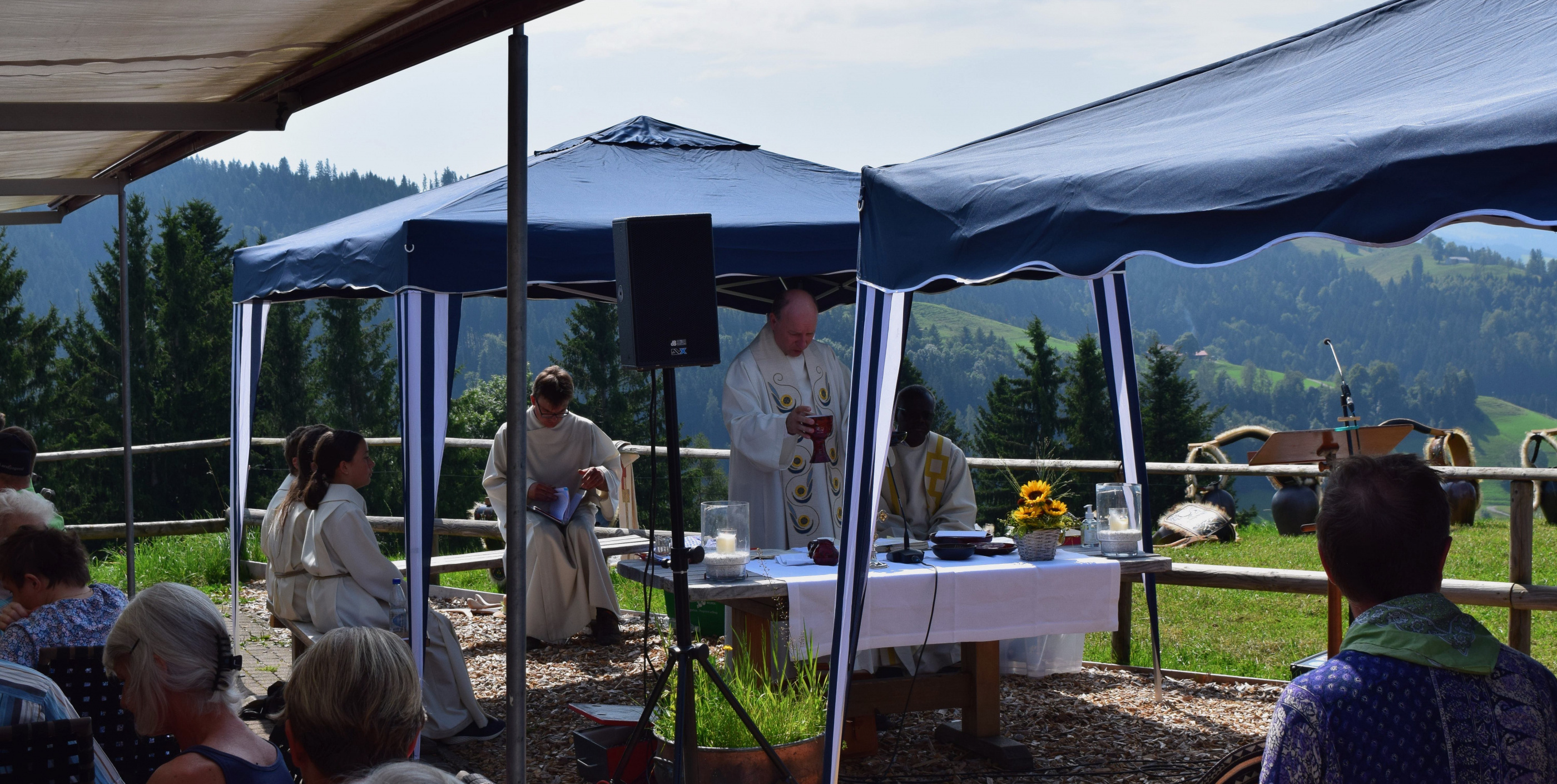 Nach einem eher nassen und grauen Sommer konnte die Seelsorgeeinheit Gäbris am vergangenen Sonntag ihren traditionellen Feldgottesdienst zum Abschluss der Sommerferien bei strahlendem Sonnenschein und warmen Temperaturen feiern. Wie jedes Jahr fand dieser vor dem Restaurant Hohe Buche in Trogen statt, das einen atemberaubenden Ausblick auf den Alpstein bietet. Von nah, aus den zur Seelsorgeeinheit gehörenden Pfarreien Teufen-Bühler-Stein, Gais und Speicher-Trogen-Wald, aber auch von fern kamen die Mitfeiernden zu Fuss, mit dem Velo oder den Shuttelbussen auf den Hügel. Ein besonderer Gast war in diesem Jahr Abbé Ambrosius Tine aus Senegal, der über die Sommermonate in der Pfarrei Teufen, Bühler, Stein zu Gast ist.