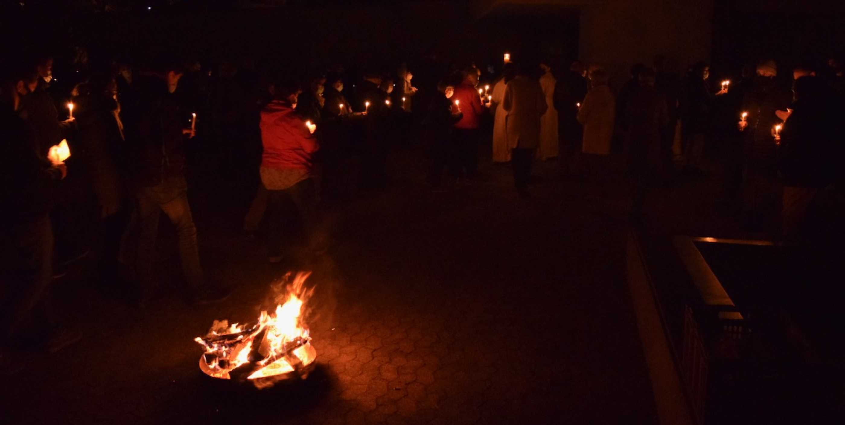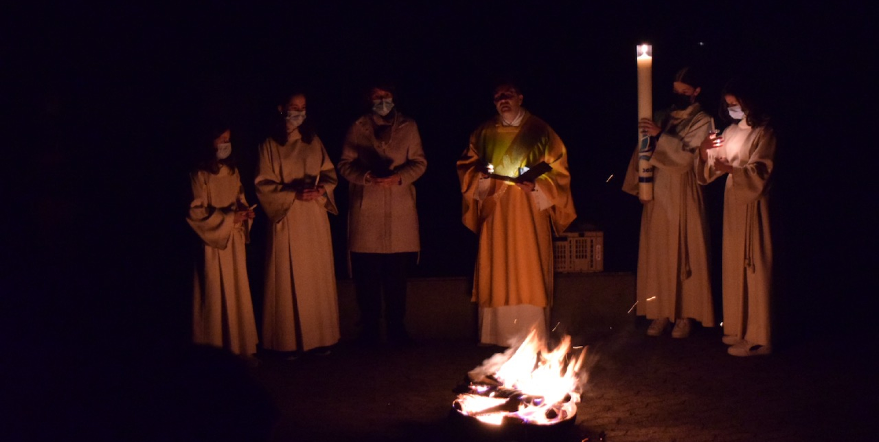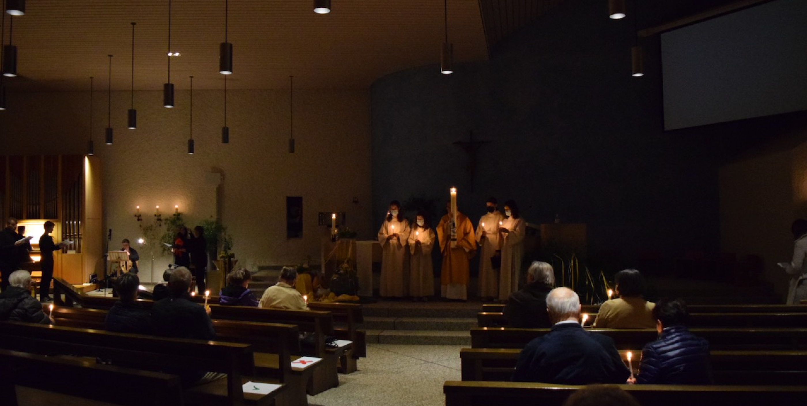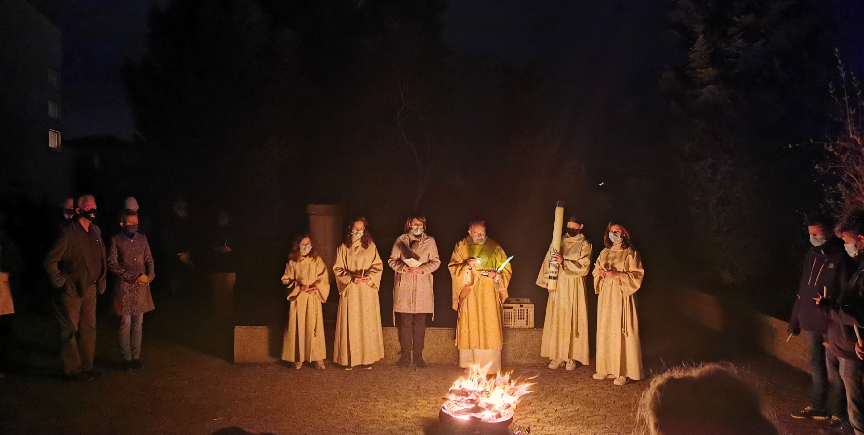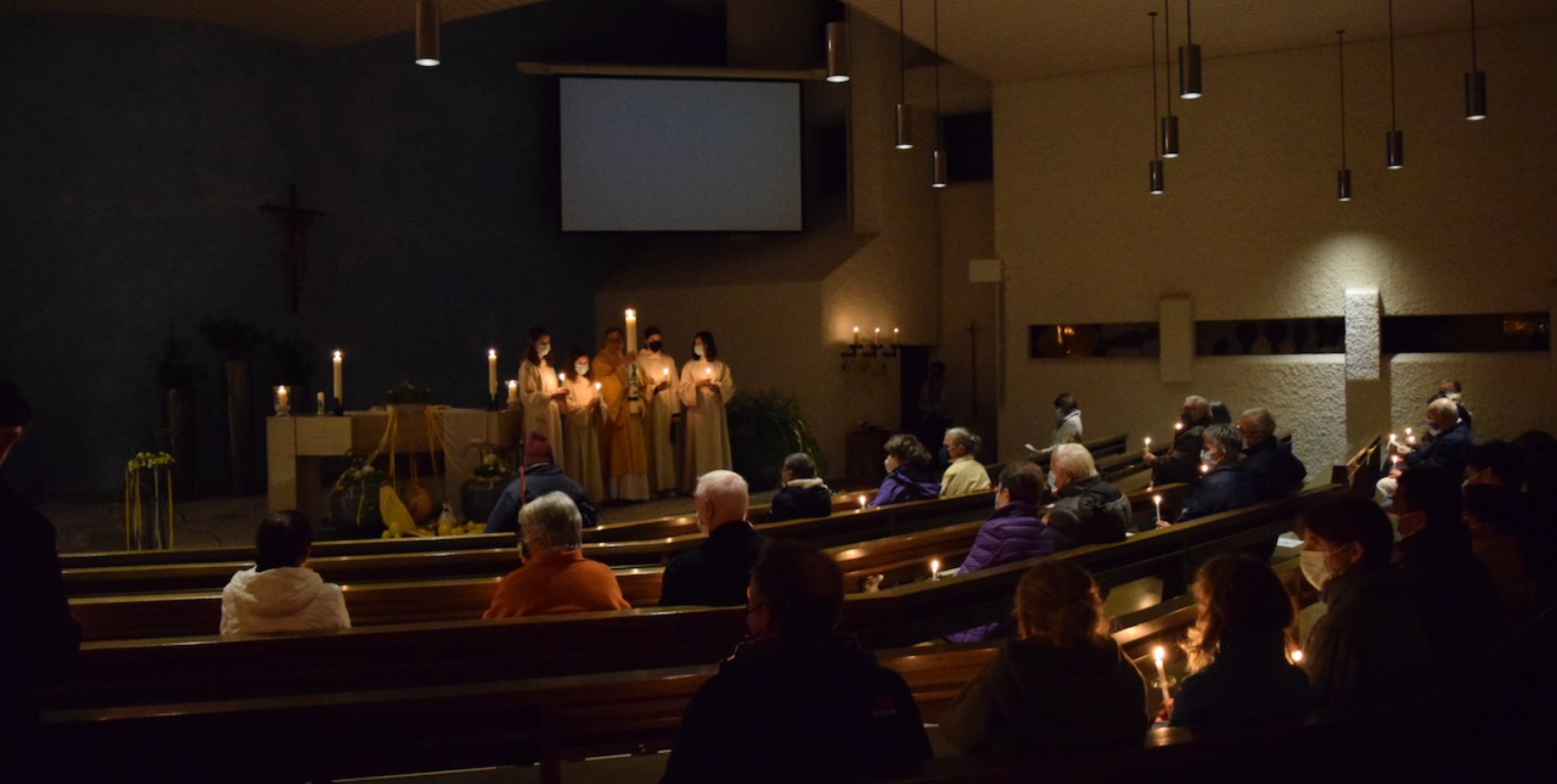 Am Samstagabend versammelten sich die Mitfeiernden der Osternachtsliturgie auf dem Vorplatz der Kirche im Stofel. Die Dunkelheit wurde durchbrochen durch das traditionelle Osterfeuer, das in der Mitte des Platzes brannte und Wärme und Licht schenkte. Die MinistrantInnen reichten das österliche Licht an die GottesdienstbesucherInnen weiter.
