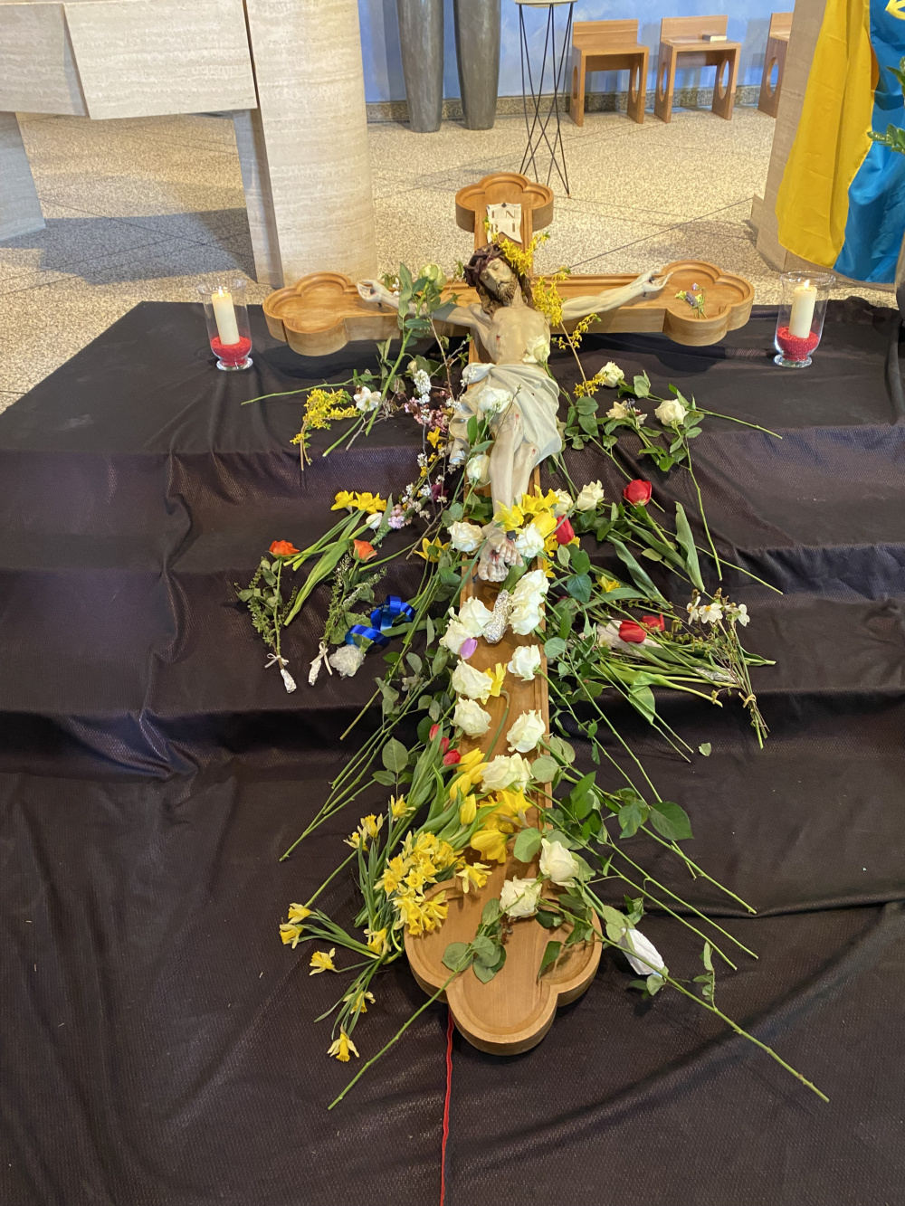 Vertereter:innen der Räte tragen stellvertretend für alle leidenden Menschen in nah und fern das grosse Kreuz in die Kirche. Die Blumen, welche die Gottesdienstbesuchenden danach zum Leidenskreuz legen, drücken die Hoffnung aus, dass das offensichtliche Böse, das sich Menschen gegenseitig und der Welt antun, sowie das Leid von Krankheit und Schicksal nicht das letzte Wort haben. Aus den verschiedenen Blumen entsteht der Osterstrauss, der in der Osternacht die Kirche ziert. Bitte bringen Sie eine Blume mit!