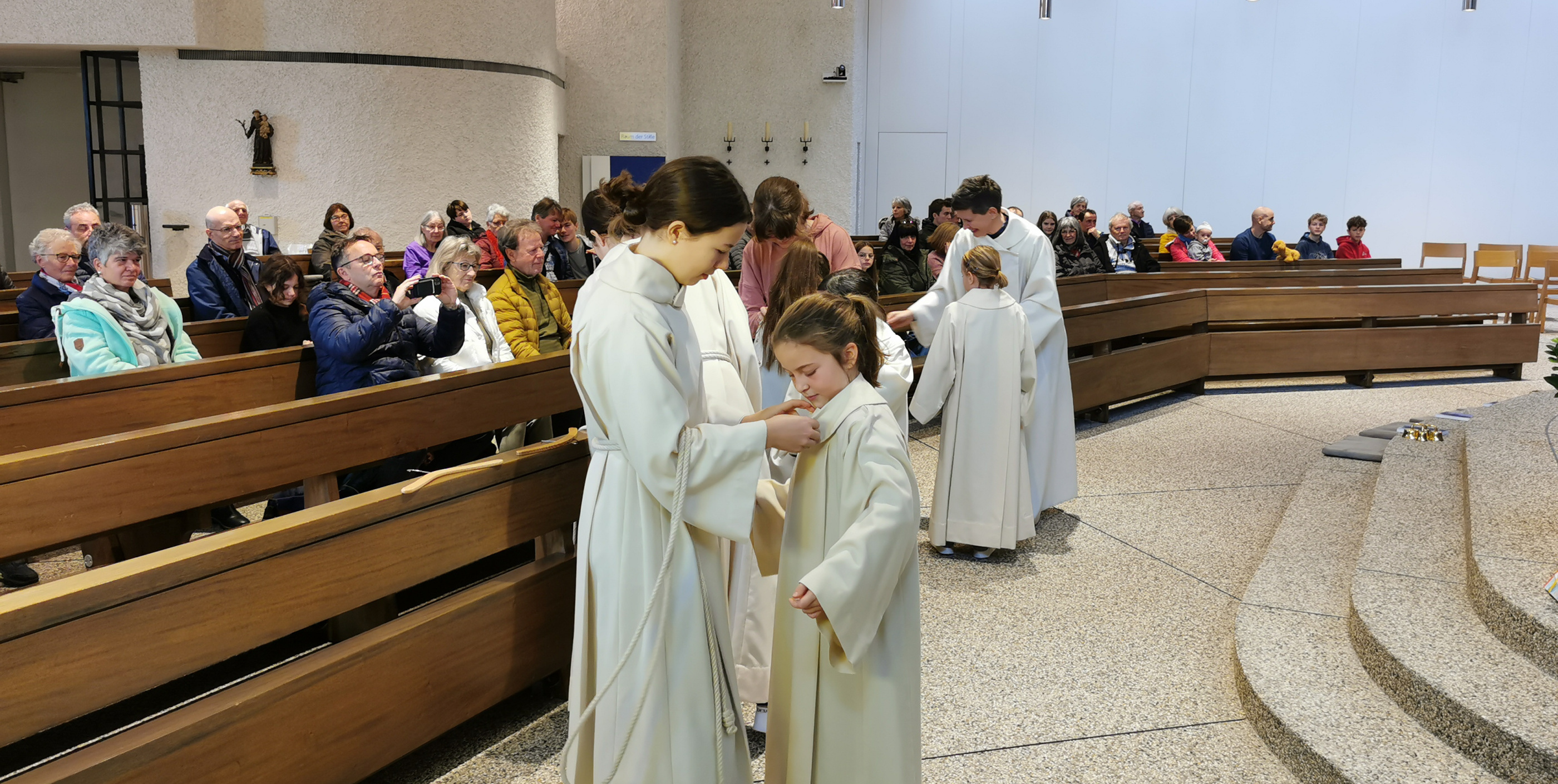 Am Sonntag, 26. November 2023 wurden vier neue Ministrantinnen feierlich in unsere Ministrantenschar aufgenommen. In einem besonderen Moment kleideten unsere langjährigen Ministranten die "Neuen" symbolisch ein – ein Zeichen der Gemeinschaft und Tradition. Die neuen Minis strahlten vor Begeisterung und freuen sich darauf, aktiv im Gottesdienst mitzuwirken.